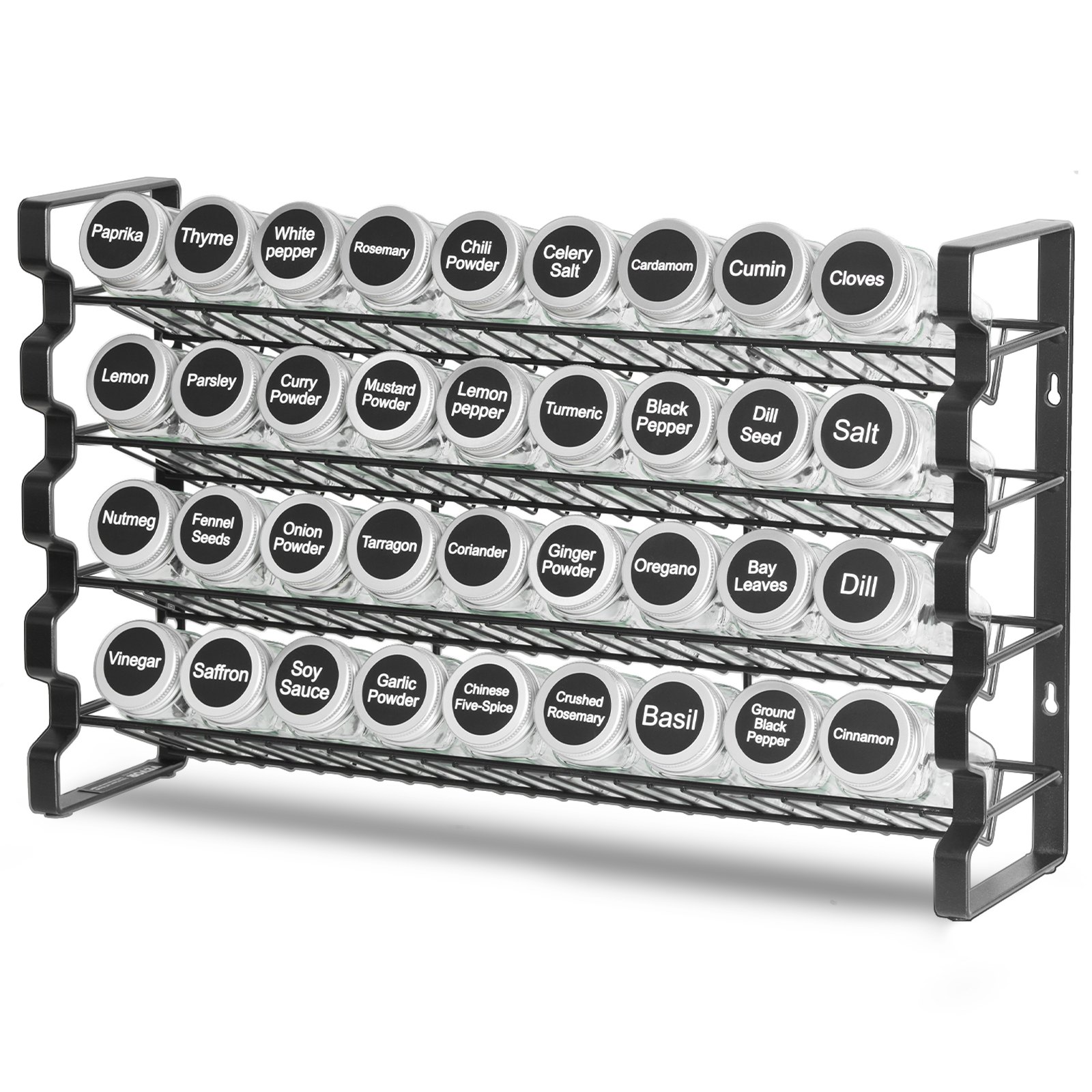 Equipped with Empty Glass Jars: This cabinet organizer shelf comes with 36 empty glass jars, each holding 4 oz. The double-layer lid design features a tight aluminum outer lid and a perforated plastic inner lid, making it easy to use spices while effectively preventing spills and moisture